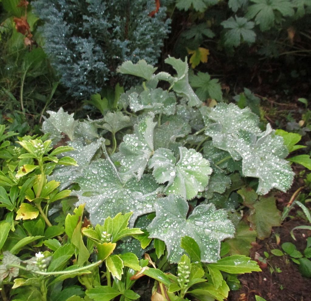 Les baies roses qui sont apparues en été deviendront de grosses perles noires et brillantes cet hiver. Les fleurs blanches resteront toutes petites mais quelle fragrance ! Planté à la mi-ombre et à l’abri du vent au pied du perron de la maison, il a survécu à quelques journées de froid très rude. Pour lui tenir compagnie : un osmanthe et un nandina :