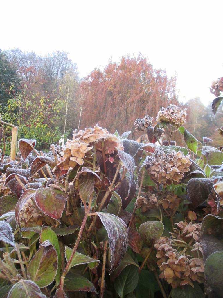 Les hydrangeas sont un peu chiffonnés mais les vernonies, les saules tortueux, les saules crevettes font de la résistance.