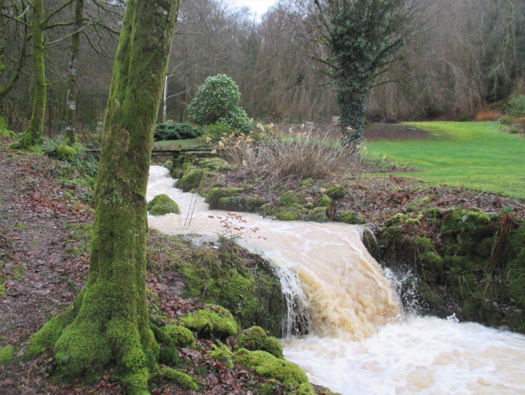 Le ruisseau est passé au niveau « alerte rouge » : les chats se tiennent à carreau dans le périmètre de sécurité de la maison et on prie pour que les ligulaires, les rodgersias et les euphorbes résistent au courant.