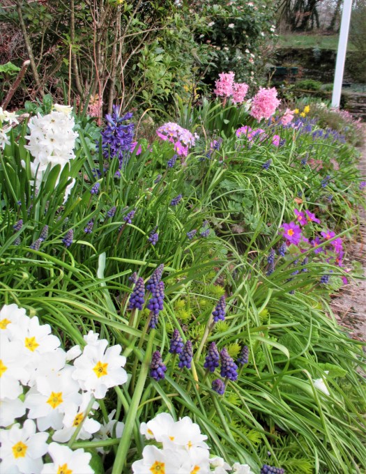 Dans la plate-bande qui borde la maison, c’est une bataille échevelée et parfumée entre jacinthes, primevères et muscaris d’où émergent difficilement les hellébores.