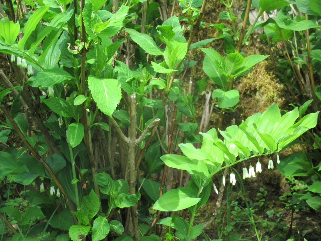 Oublions les trois malheureux brins de muguet qui s’obstinent à survivre dans notre sous-bois. Il y a tant de jolies fleurs blanches qui illuminent les bords du ruisseau. La plus étonnante est pour moi le sceau de Salomon, cette jolie hampe aux feuilles dressées comme autant de protections de ses grelots blancs. On l’appelle aussi « faux muguet »…