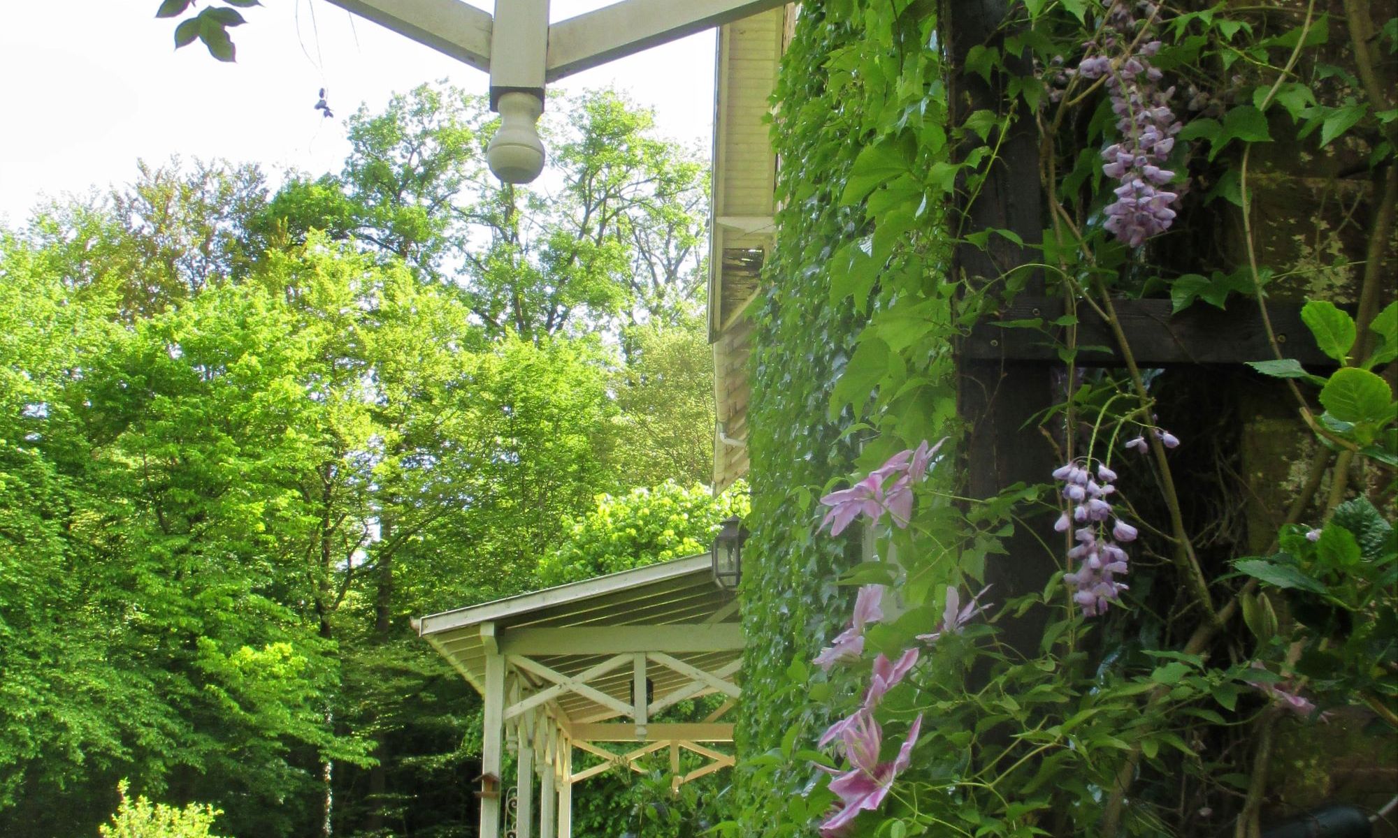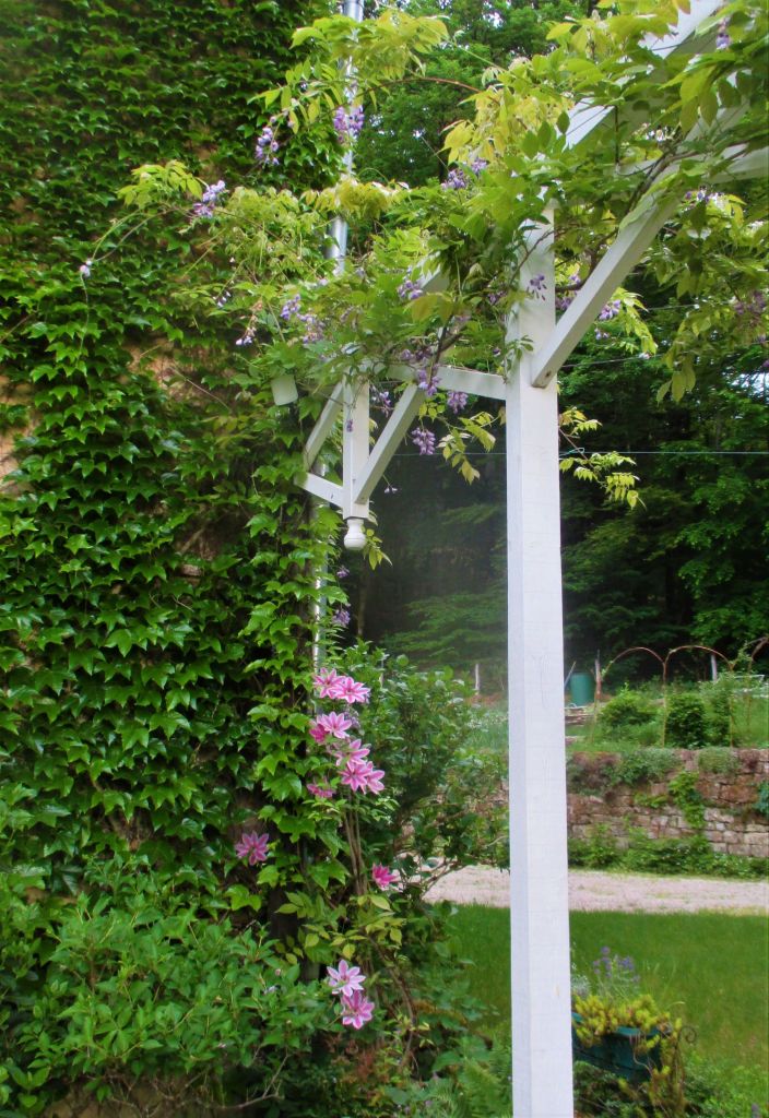 Cette clématite, Clematis Docteur Ruppel, je crois (?) végétait, le pied à l’abri du soleil, en compagnie d’un hortensia. Mais la voilà rayonnante, en compagnie de la glycine de Chine. Il suffit parfois d’une rencontre pour changer la vie…