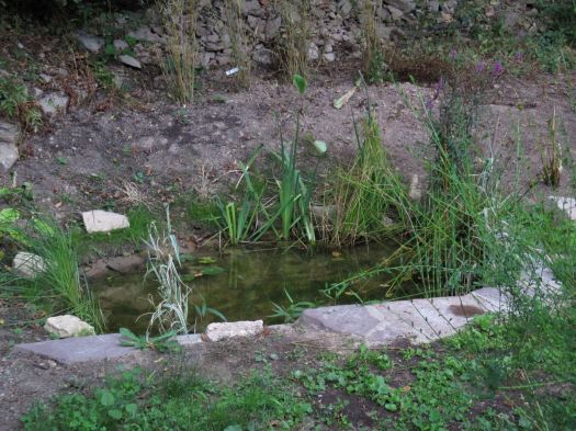 Il y avait tant à faire que ce n’est qu’en 2015 que nous avons entrepris de donner vie à cet « étage » du jardin. En commençant par soulever la bâche. Surprise : une mare… puis une margelle qui laisse penser qu’il s’agit plutôt d’une source qui devait, dans un lointain passé, être aménagée. Peut-être en fontaine ?