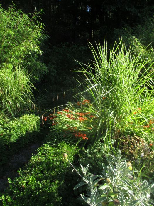 Mais à force de respecter la quiétude des grenouilles, la végétation a pris des proportions hors de contrôle. Les graminées ont envahi les bords de la mare, les crocosmias se sont affaissés sous le poids de leurs longues grappes devenues inaccessibles…