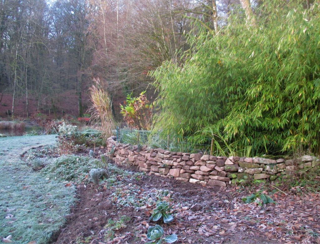 Il était temps d’agir. Les travaux de cet hiver ont été couronnés de neige : un mur en pierres sèches double l’arc de bambous, de graminées, de crocosmias, d’hémérocalles et d’iris. Le grillage qui maintiendra leur floraison se fera oublier sous leurs feuillages et derrière les euphorbes, les phlomis et les sedums qui vont se densifier.