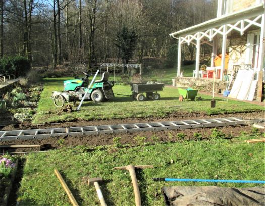 Merci Michel pour la mise en place de la plaque de cheminée ! Le reste est résultat de deux semaines de travaux intensifs de nos petits bras : désherbage, dépierrage, pose d’une bâche anti-herbe, épandage d’une demie-tonne de sable, pose de feutre textile et de dalles alvéolées sur les bords, remplissage d’une tonne de gravier rouge.