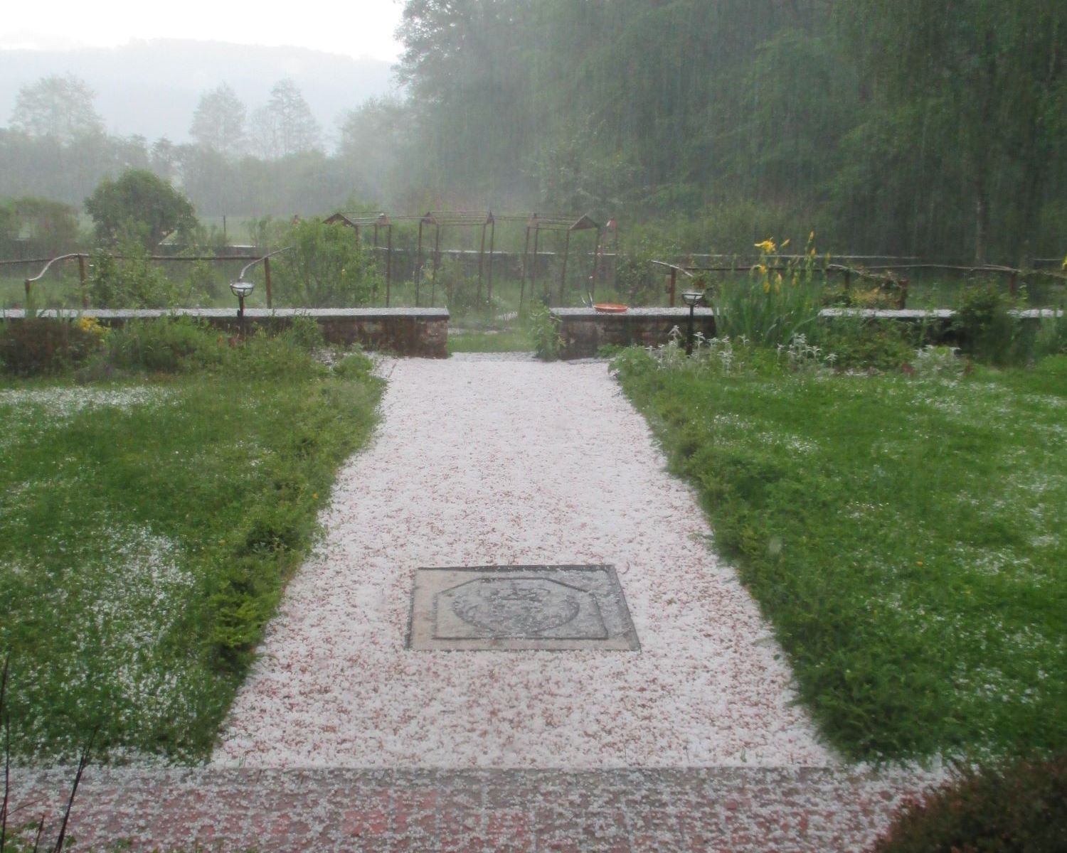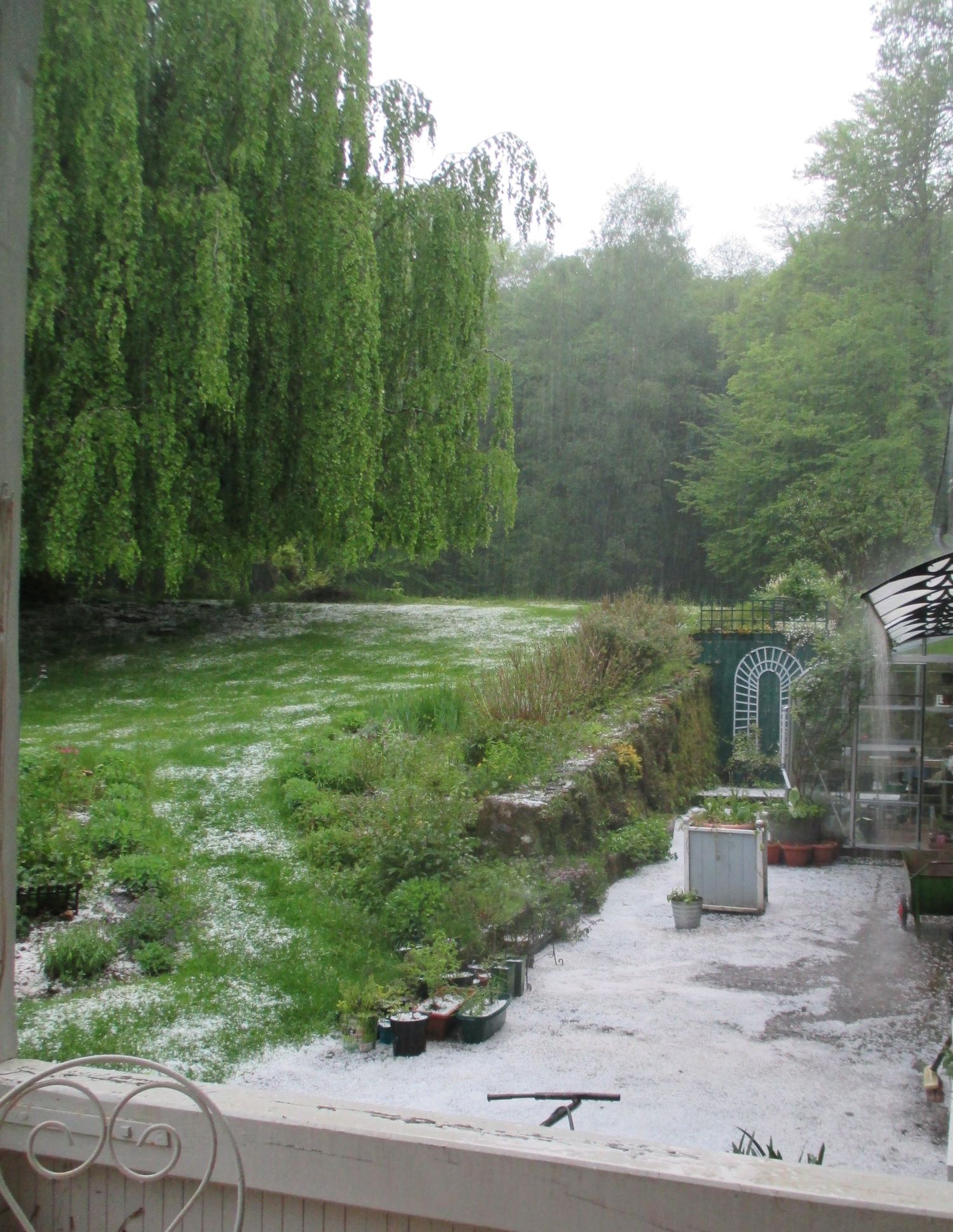 Orage et désolation. Hier soir, la grêle s’est abattue deux heures durant sur notre forêt et notre jardin. Les iris se sont retrouvés en guenilles, les oiseaux se sont tus. Et l’équipement du jardinier ne peut résister à un tel déluge…