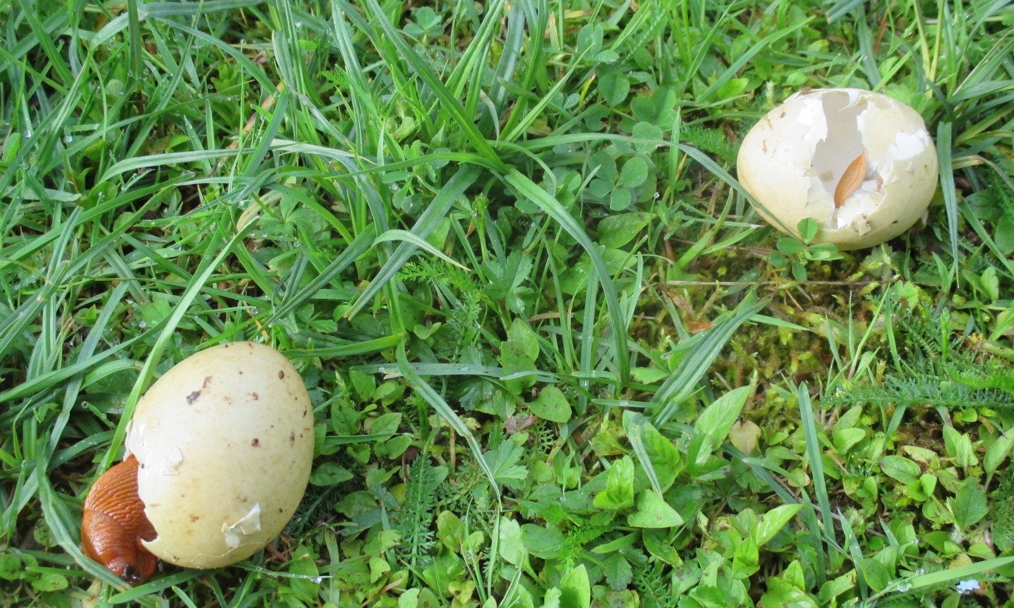 Il n’y a pas que les giboulées et les grêlons qui se ramassent à la pelle en ce curieux mois de mai. Ce matin, j’ai trouvé dans l’herbe, entre le ruisseau et l’étang, deux beaux oeufs, cadeaux de nos colverts. Mais trop tard, les limaces en avaient déjà fait leur festin…