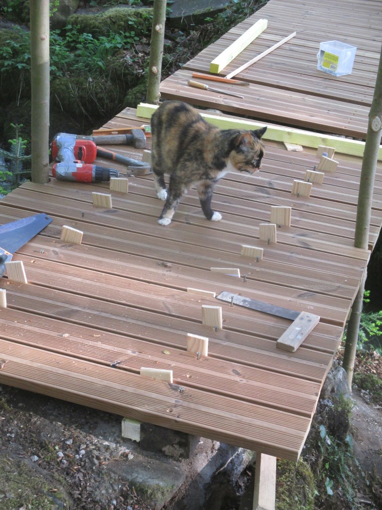 John’s Bridge! – well, I’m flattered to see that my hard work to reconstruct our ‘Bridge Over Troubled Water’ has been recognised. But I don’t wish to take all the credit since, as with many of the practical projects in the garden, it was a joint effort in which Danielle issued the request and I did the back-breaking work. It has to be admitted that on this occasion I was easily convinced as, after close on fifty years of service, it’s recently been showing signs of breaking up at any moment. As in the words of the famous American folk song ‘Oh my darling Clementine’ the old bridge was about to ‘tremble and disassemble’ and I would surely have been charged with ‘homicide involontaire’ if Danielle ‘fell into the foamy water and was lost and gone forever’ on one of her morning walks round the garden.