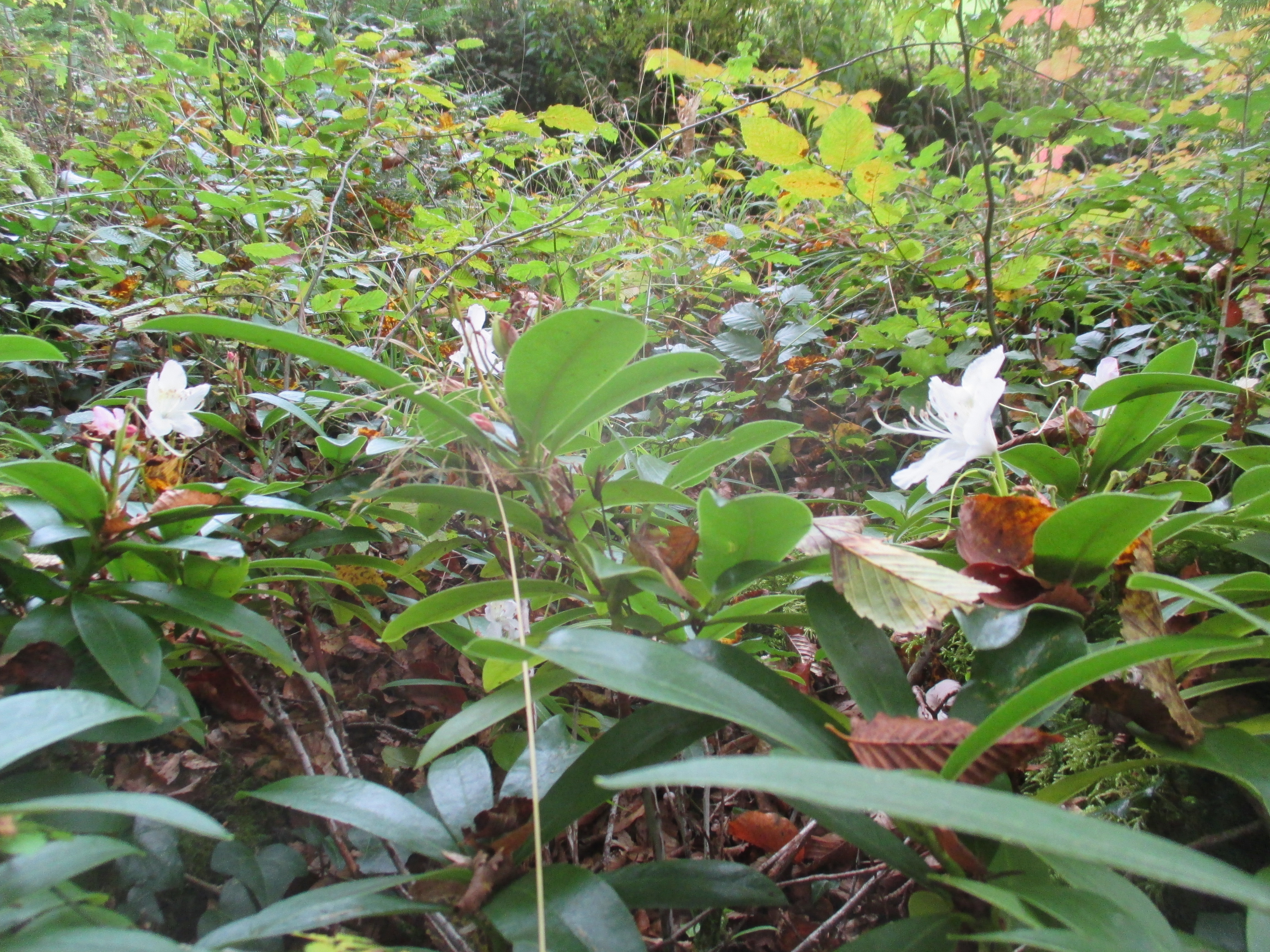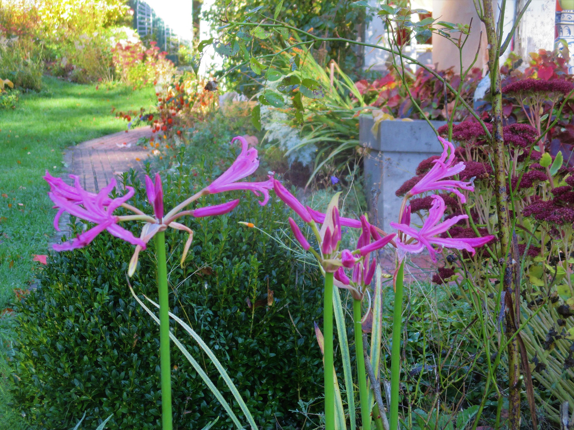 Des rhododendrons en fleurs (timides) dans le sous-bois, un hydrangéa qui donne sa première fleur en même temps que le rougissement de son feuillage, les lis de Guernesey qui se réveillent enfin…