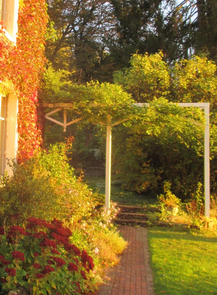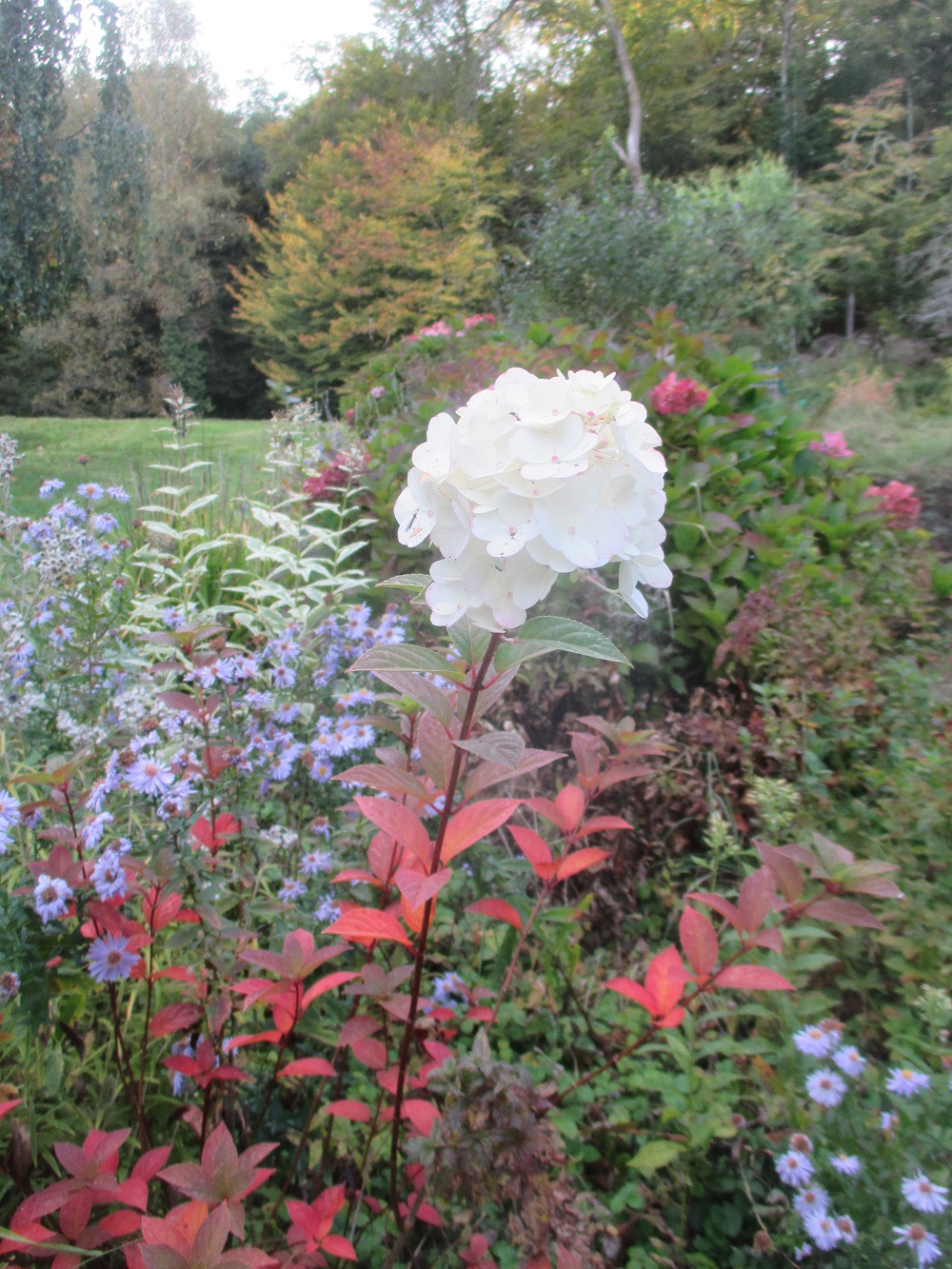 Et les couleurs incomparables de l’automne. Sur fond d’ocres et de terra cota, le feuillage de l’hortensia bleu prend des nuances d’améthyste au violet profond.