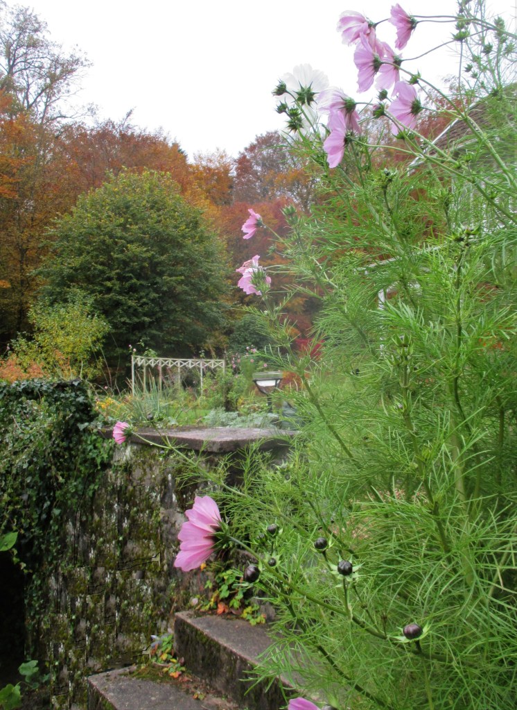 Les cosmos, restés chétifs tout l’été, atteignent près de 2 mètres 50 de hauteur et leur floraison est bien décidée à résister aux petits matins frileux.