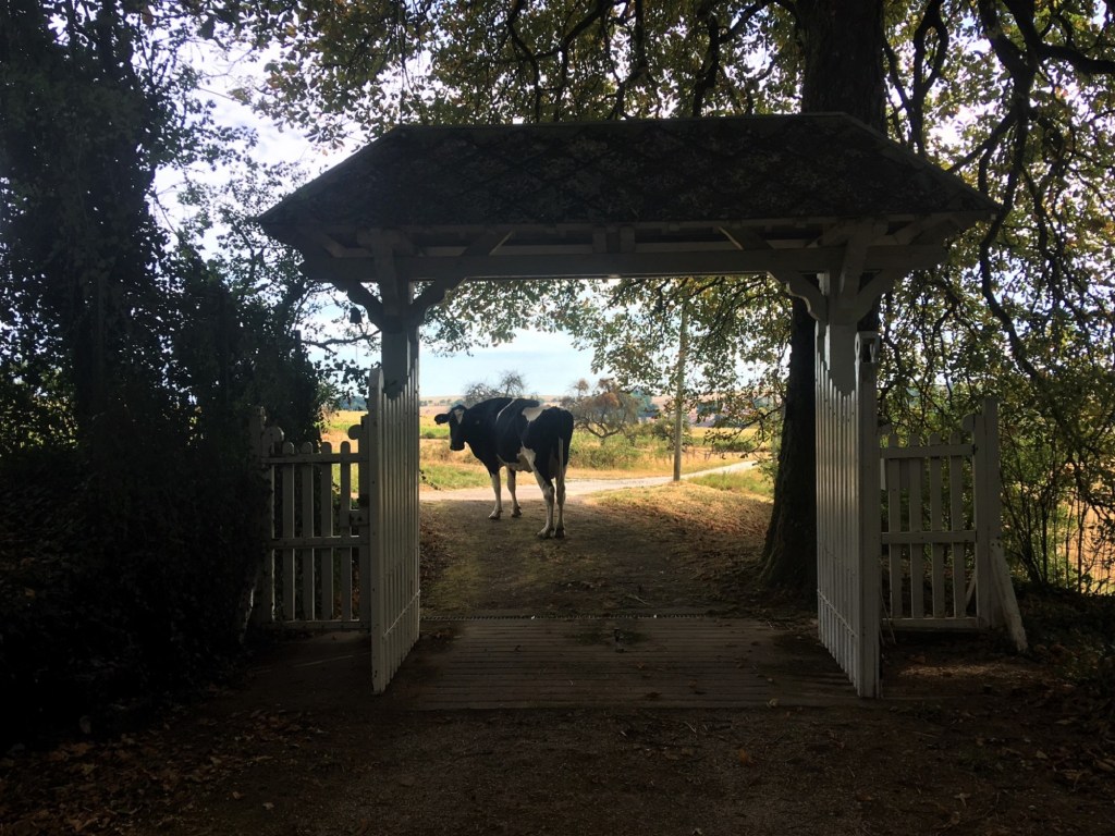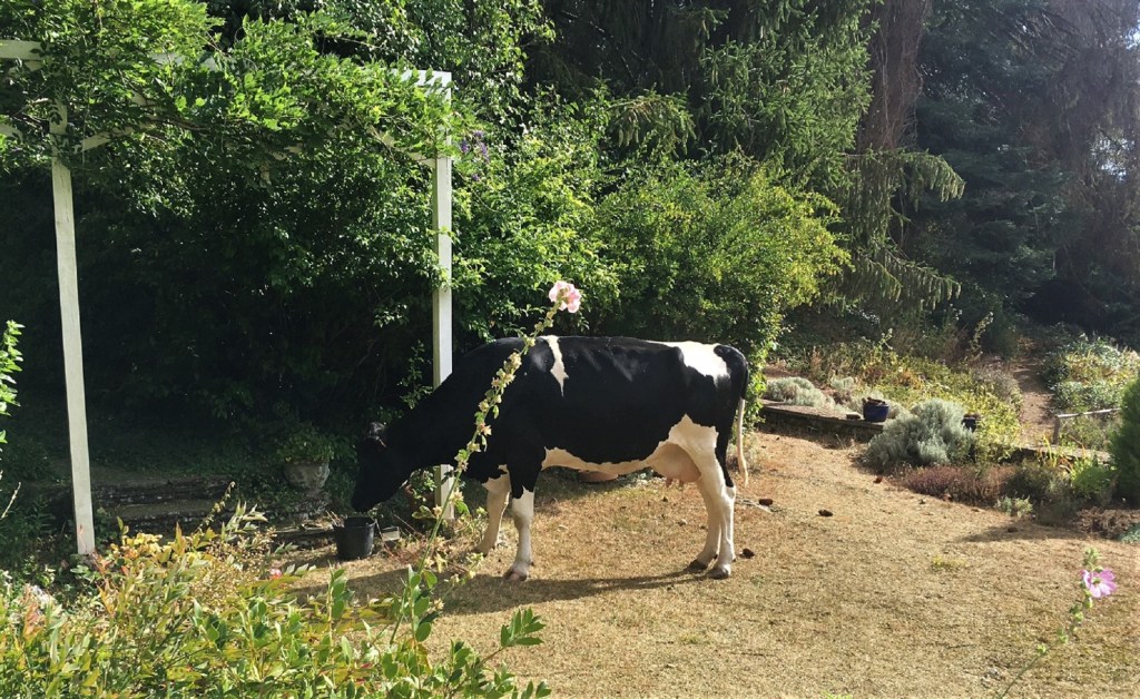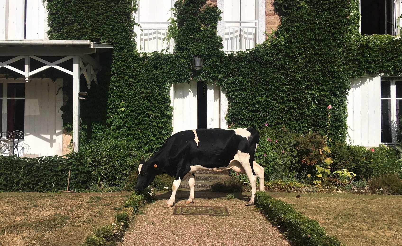 Trois vaches ont le privilège de pâturer aux portes de notre jardin (alors que des centaines de leurs congénères sont assignées à résidence). Cependant, le pré devenant de plus en plus indigeste, la plus hardie des trois a trouvé une faille dans la clôture. En toute logique, l’herbe du fossé devrait être plus tendre. Desséchée là aussi.