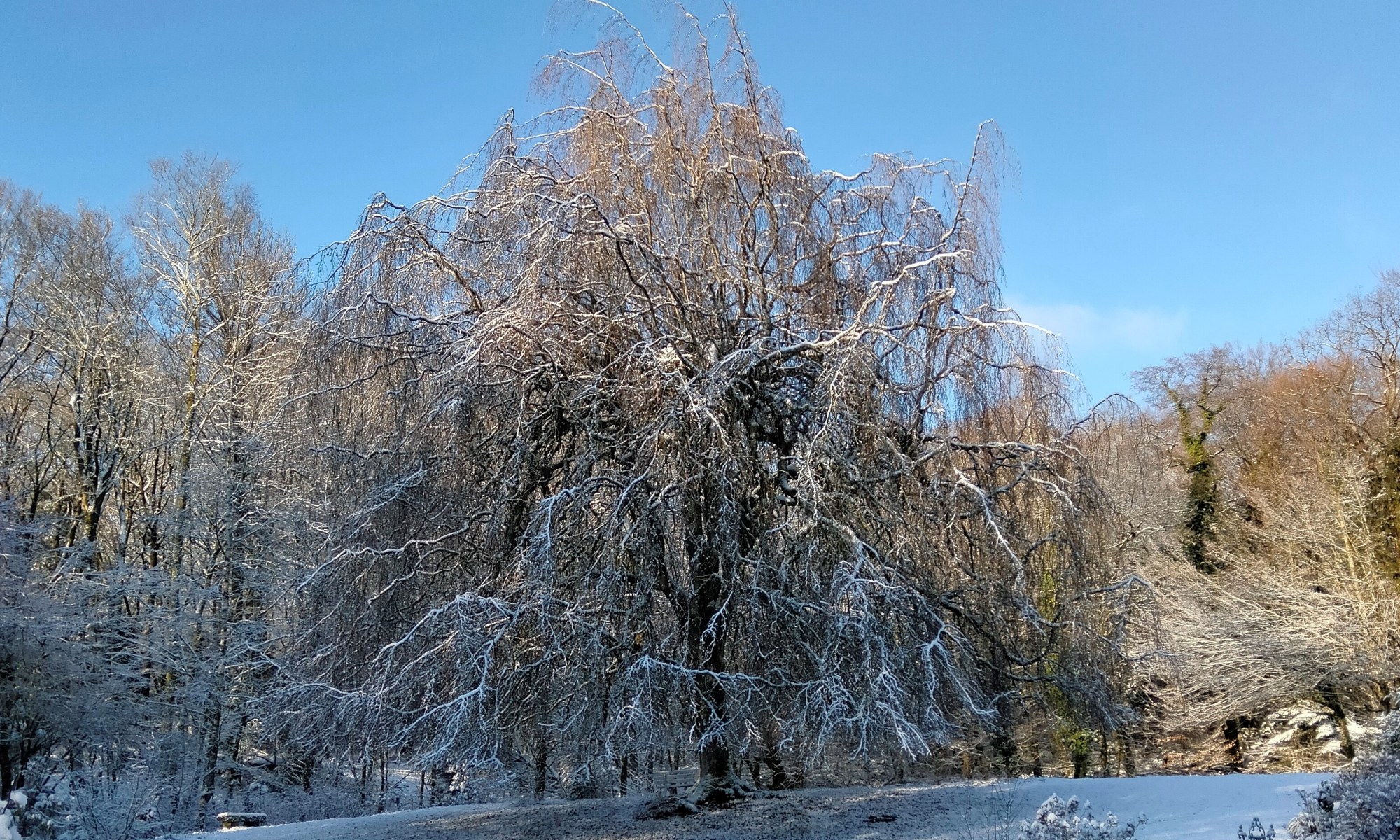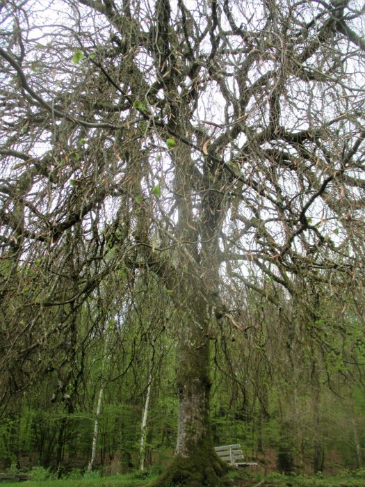 Quel âge peut-il avoir ? Qui l’a planté là ? Difficile d’imaginer un oiseau transportant une graine du parc thermal de Vittel ou de Contrexéville. Difficile d’imaginer que cette graine de hêtre pleureur, Fagus sylvatica ‘Pendula’, ait pu s’imposer dans la jungle des faines « communes » qui éclosent chaque printemps.