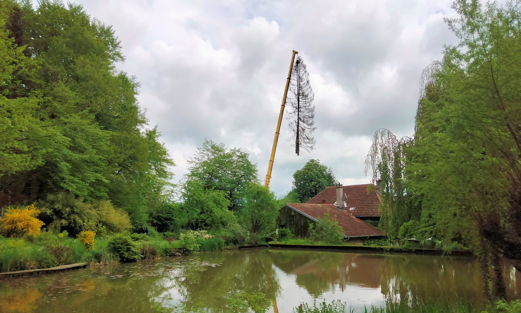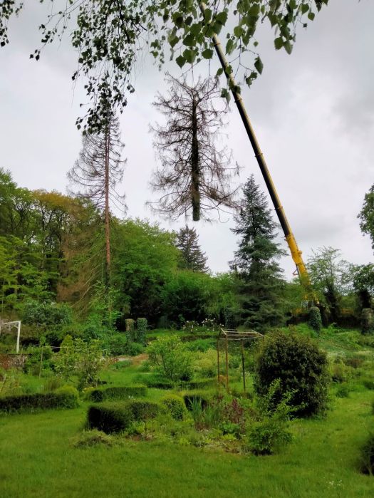 Il n’aura fallu qu’une matinée pour démonter dix épicéas de 30 mètres de hauteur et de plusieurs décennies d’âge. Et c’est en moins d’une heure que leurs dépouilles ont été réduites en broyats dans un grand vacarme et dans de grandes vapeurs poussiéreuses au parfum de résine.