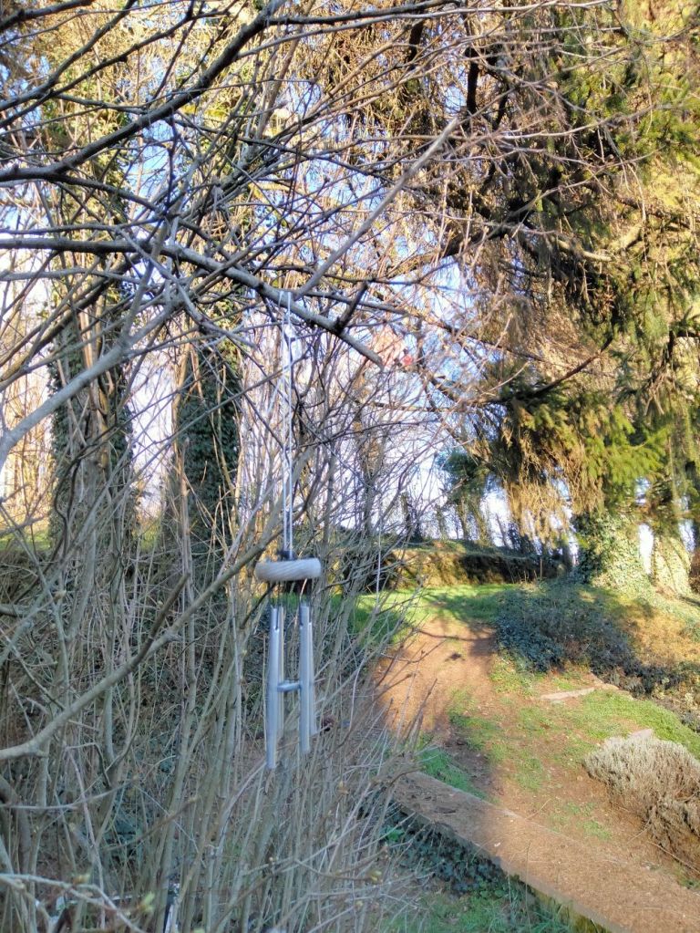 Suspension, dans les arbres, de mobiles composés de fines et longues lames de métal : acier, aluminium, zinc, cuivre… qui sous l’effet du vent vont produire des sons, voire refléter des images (acier inoxydable ou chromé) ;