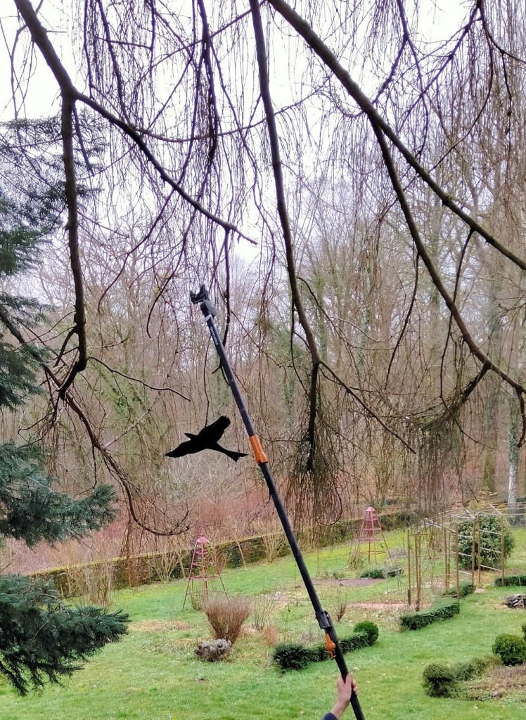 Quand le bûcheron nous annonça qu’il faudrait attendre le mois de mai pour démonter nos épicéas (stabilité de la grue oblige), notre première pensée fut pour nos mésanges. Car au bout de l’allée, sous les branches des derniers épicéas, un lilas entremêlé au cognassier du Japon, au seringat et au berberis Koreana leur offrent le meilleur (et le plus parfumé) des refuges. La première mesure fut de déplacer les boules de graines vers le potager. Elles ont aussitôt suivi. Restait cependant à éviter qu’elles ne reviennent dans le cognassier ou le berberis pour y faire leurs nids.