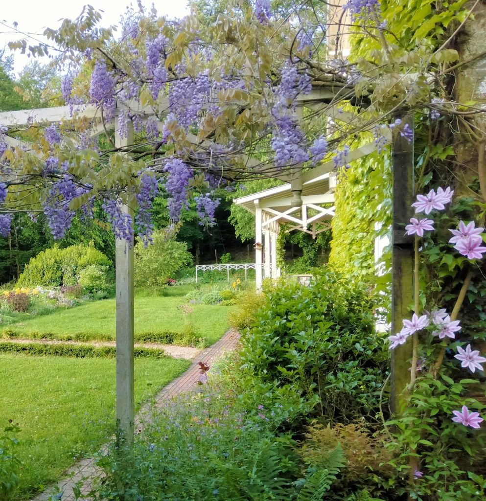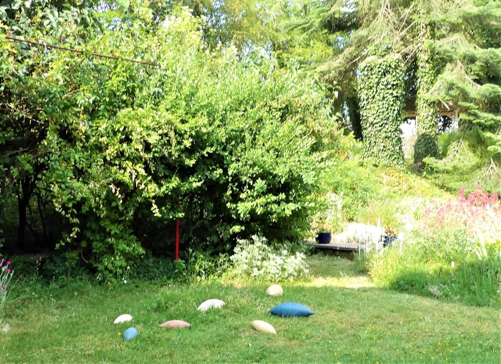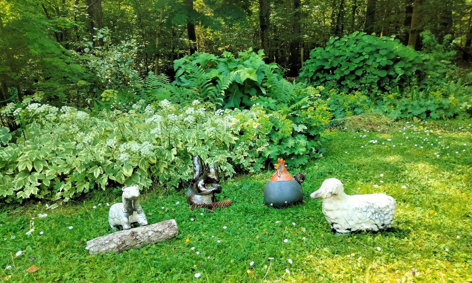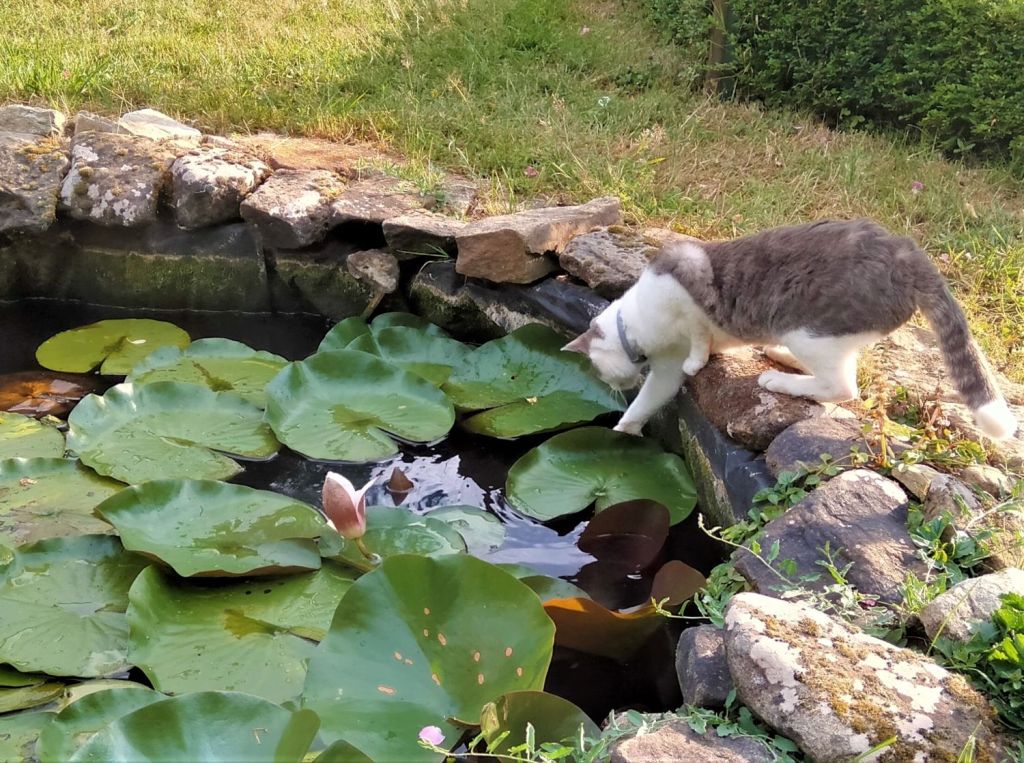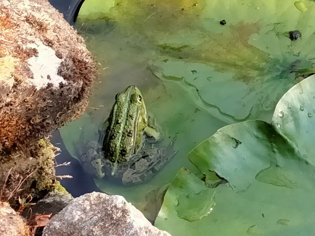 Oubliées les roses et les pivoines, oubliées sculptures et céramiques quand vingt-trois grenouilles (peut-être plus) font le spectacle entre les nénuphars du petit bassin. Pour ajouter au plaisir de l’observateur, elles sont toutes identiques mais de tailles différentes, de deux à une dizaine de centimètres de longueur. Peut-être des grenouilles rieuses…