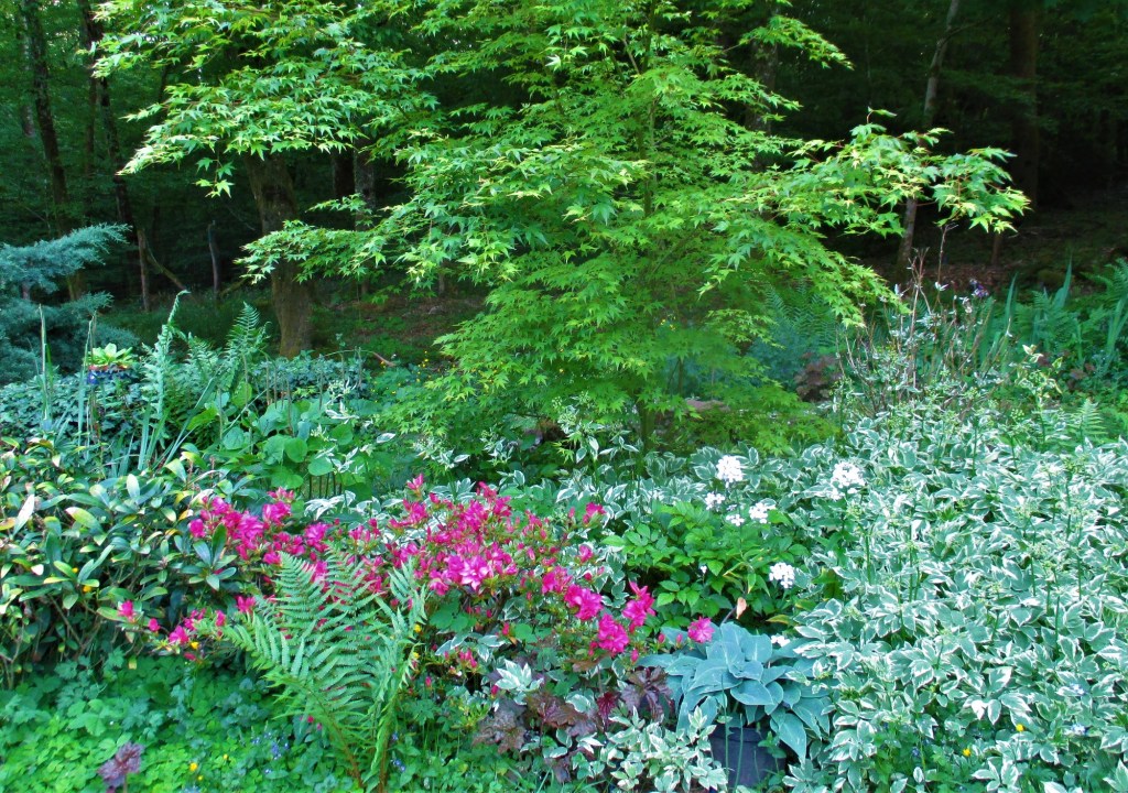 Et au bord du ruisseau, sous l’érable du Japon, l’azalée émerge des fougères, des hostas bleutés, des lamiers argentés, les astilbes et les podagres.