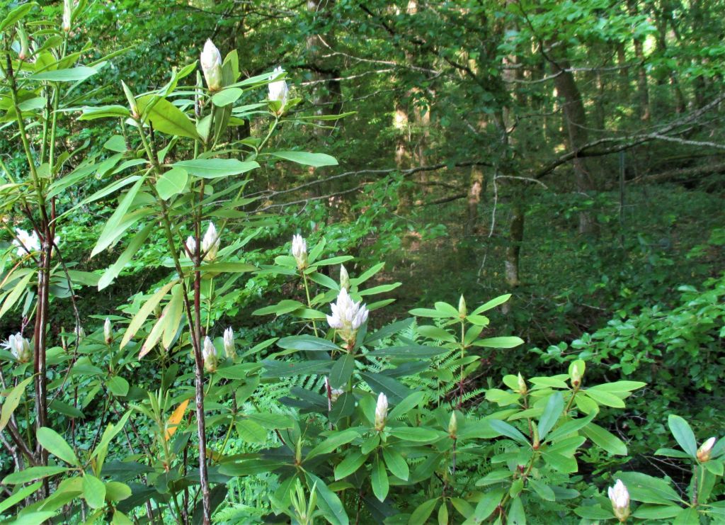 Plus timidement dans le sous-bois, le rhododendron blanc s’éveille lui aussi mais il faudra encore attendre pour voir ses corolles s’ouvrir et révéler les chaudes nuances de leur coeur d’or.