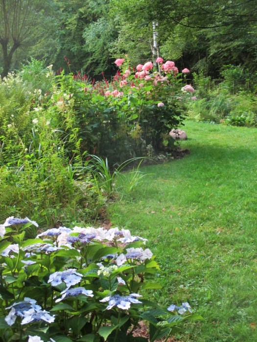 Vagues de lysimaques de ChineMassif en noir et blanc à la mi-ombre du vieux hêtre pleureur.Encore un petit effort et nous serons au bord de l’étang. Entre l’étang et le ruisseau, les hydrangeas Koria et Invincibelle.Eupatoire pourpre Persicaria amplexicaulis dans la brume de l’automneLe grand hêtre pleureur au bord de l’étang gelé